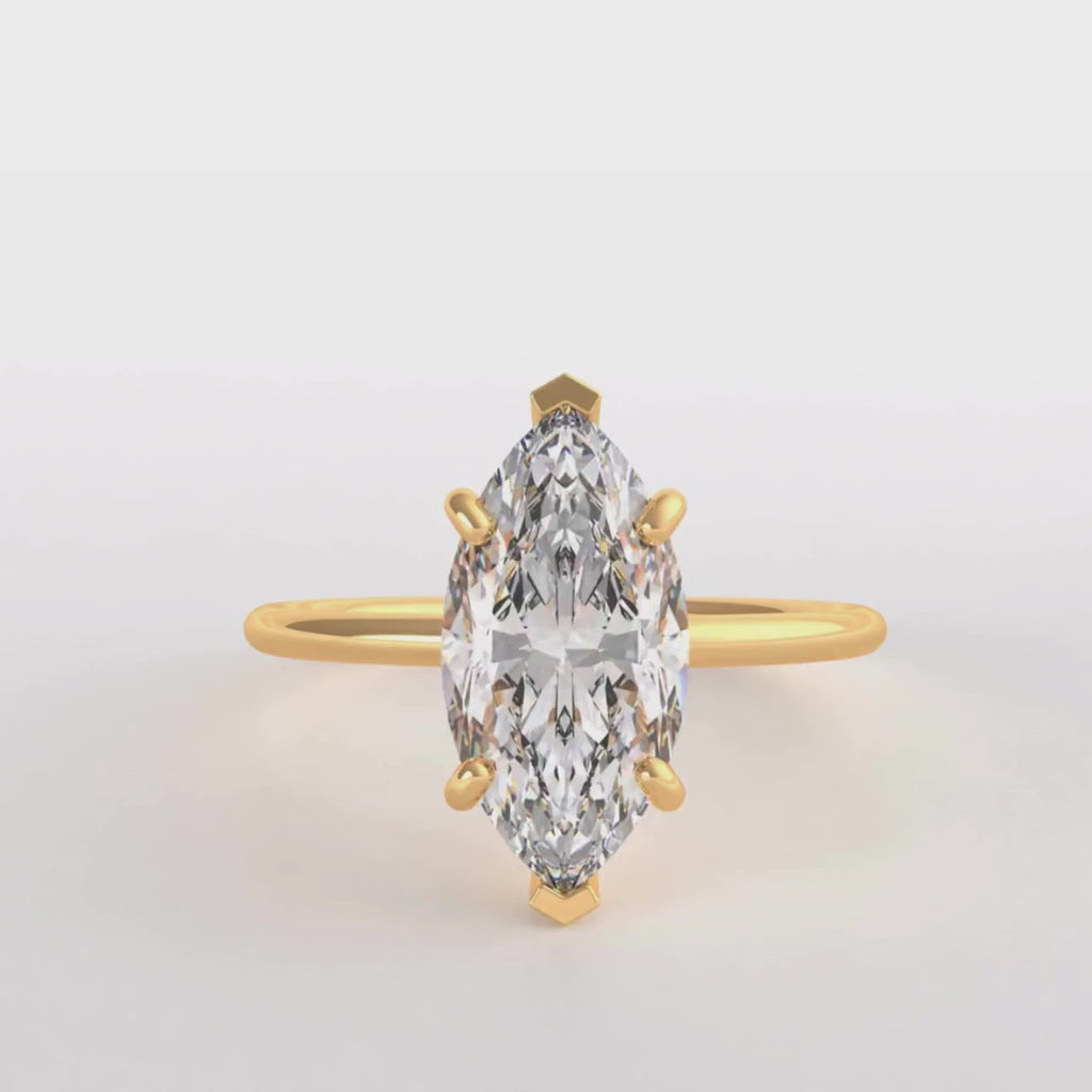 This striking design features a brilliant marquise-cut lab-grown diamond, gracefully set in a classic six-prong setting that elongates the finger and creates a captivating sparkle from every angle. Crafted in luxurious yellow gold, the minimalist band highlights the diamond’s unique shape and dazzling clarity.